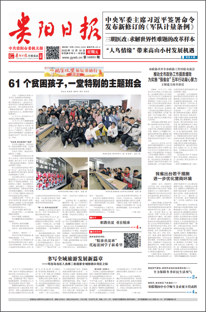 《貴陽日報》日發(fā)行量12萬份,內(nèi)容豐富,形式活潑;印刷上乘,全國發(fā)行,是貴陽地區(qū)發(fā)行量最大和最具影響力的黨報。