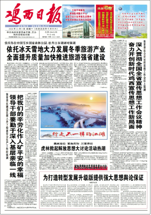 《雞西日?qǐng)?bào)》創(chuàng)刊于1948年11月15日,由雞西新聞傳媒集團(tuán)主辦,對(duì)開4版,膠版彩色印刷,日發(fā)行量5萬(wàn)余份。輻射雞西市所轄的市1縣6區(qū)12個(gè)礦。