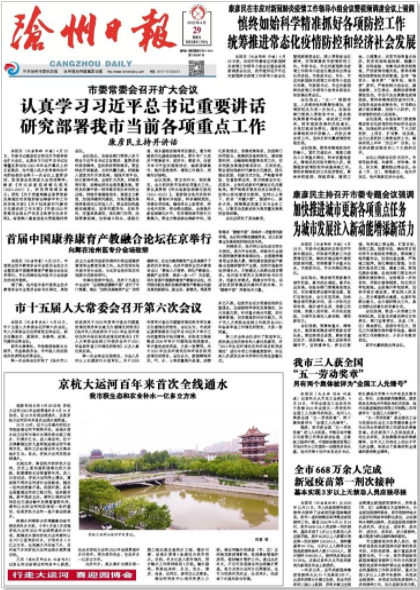 《 滄州日?qǐng)?bào)》是滄州市委機(jī)關(guān)報(bào),由滄州市委主管主辦!稖嬷萑?qǐng)?bào)》創(chuàng)刊于1956年7月1日,初始稱(chēng)作《滄州報(bào)》,后改為《渤海日?qǐng)?bào)》,直到《滄州日?qǐng)?bào)》。