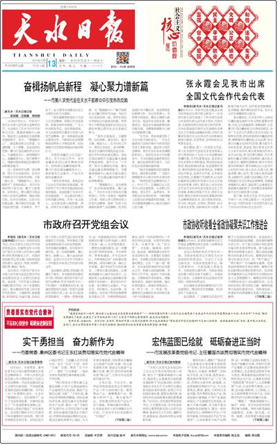 《天水日報(bào)》是中共天水市委機(jī)關(guān)報(bào),1985年5月第三次復(fù)刊,由中共天水市委主辦、主管。國內(nèi)統(tǒng)一刊號CN62—0012,郵發(fā)代號53—25。復(fù)刊之初,《天水日報(bào)》名為《天水報(bào)》,每周一期,4開4版。