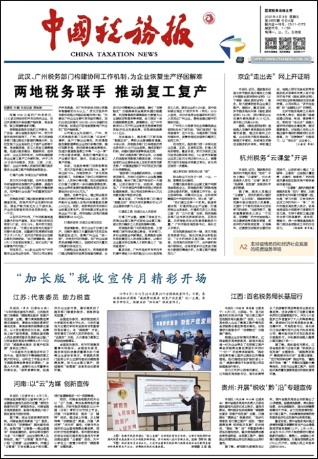 《中國(guó)稅務(wù)報(bào)》創(chuàng)刊于1991年1月3日,是國(guó)家稅務(wù)總局主管的全國(guó)性經(jīng)濟(jì)類專業(yè)報(bào)紙。目前為周三刊,周一、周三對(duì)開(kāi)十二版,周五對(duì)開(kāi)八版,發(fā)行量達(dá)40萬(wàn)份!吨袊(guó)稅務(wù)報(bào)》是全國(guó)性經(jīng)濟(jì)類報(bào)紙。由國(guó)家稅務(wù)總局主辦。周四出版,對(duì)開(kāi)8版。設(shè)有"稅收政策分析"、"稅收與經(jīng)濟(jì)"、"稅收與社會(huì)"、"稅制改革"、"經(jīng)濟(jì)透視"、"經(jīng)濟(jì)縱橫"等數(shù)十個(gè)欄目及綜合副刊。在全國(guó)各省、自治區(qū)、直轄市及計(jì)劃單列市國(guó)稅系統(tǒng)有36個(gè)記者站,在地稅系統(tǒng)有25個(gè)特約記者。在北京、長(zhǎng)春、武漢、上海、成都、濟(jì)南、鄭州、蘭州設(shè)報(bào)紙分印點(diǎn)。中國(guó)稅務(wù)報(bào)登報(bào)易
