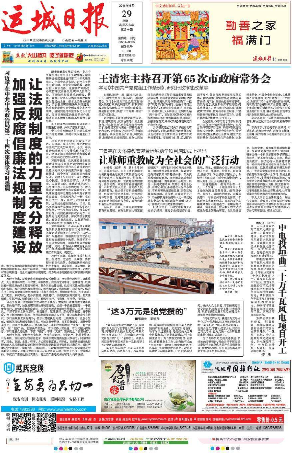 《運城日報》是中共運城市委機關(guān)報,是運城市最具權(quán)威性,最有影響力,發(fā)行量最大,覆蓋密度最廣的報紙,多年來一直被評為兩省優(yōu)秀報紙,采用激光照排,雙色、四色膠印、印刷質(zhì)量在省名列前茅。