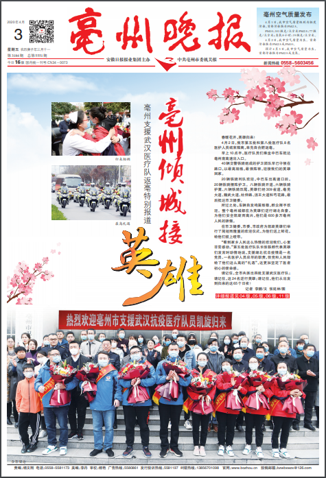 原《亳州報(bào)》于2008年10月8日更名為《亳州晚報(bào)》,旨在探索新聞宣傳的新途徑,讓黨報(bào)的面孔更親和、內(nèi)容更豐富、聲音更主流、服務(wù)更貼近、傳播更有效。更名后的《亳州晚報(bào)》將堅(jiān)持“四個不變”,即中共亳州市委機(jī)關(guān)報(bào)的性質(zhì)不變,圍繞中心,服務(wù)大局的方針不變,黨和政府的喉舌作用不變,“黨報(bào)性質(zhì)、晚報(bào)風(fēng)格、市場化運(yùn)作”的辦報(bào)思路不變。