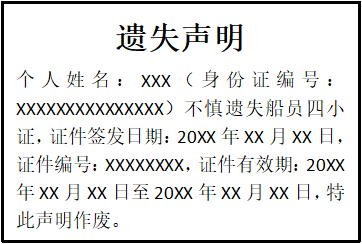 個(gè)人姓名:XXX(身份證編號:XXXXXXXXXXXXXXX)不慎遺失船員四小證,證件簽發(fā)日期:20XX年XX月XX日,證件編號:XXXXXXXX,證件有效期:20XX年XX月XX日至20XX年XX月XX日,特此聲明作廢。