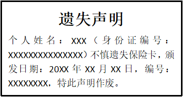個人姓名:XXX(身份證編號:XXXXXXXXXXXXXXX)不慎遺失保險卡,頒發(fā)日期:20XX年XX月XX日,編號:XXXXXXXX,特此聲明作廢。