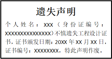 個人姓名:XXX(身份證編號:XXXXXXXXXXXXXXX)不慎遺失工程設計證書,證書頒發(fā)日期:20XX年XX月XX日,證書編號:XXXXXXXX,特此聲明作廢。