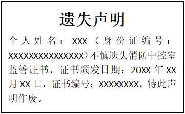 個人姓名:XXX(身份證編號:XXXXXXXXXXXXXXX)不慎遺失消防中控室監(jiān)管證書,證書頒發(fā)日期:20XX年XX月XX日,證書編號:XXXXXXXX,特此聲明作廢。