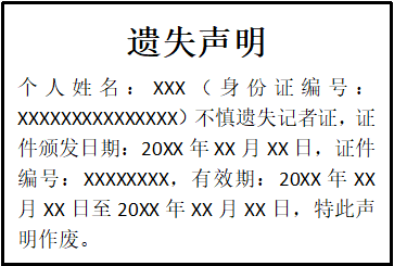 個(gè)人姓名:XXX(身份證編號(hào):XXXXXXXXXXXXXXX)不慎遺失記者證,證件頒發(fā)日期:20XX年XX月XX日,證件編號(hào):XXXXXXXX,有效期:20XX年XX月XX日至20XX年XX月XX日,特此聲明作廢。