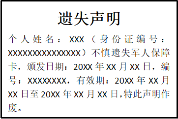 個人姓名:XXX(身份證編號:XXXXXXXXXXXXXXX)不慎遺失軍人保障卡,頒發(fā)日期:20XX年XX月XX日,編號:XXXXXXXX,有效期:20XX年XX月XX日至20XX年XX月XX日,特此聲明作廢。