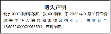 北京XXX律師事務所、張XX律師,于2020年X月X日不慎遺失中華人民共和國律師執(zhí)業(yè)證,執(zhí)業(yè)證號136032XXXXXX63693,聲明作廢。