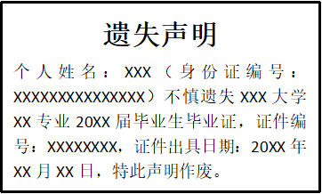 個人姓名:XXX(身份證編號:XXXXXXXXXXXXXXX)不慎遺失XXX大學(xué)XX專業(yè)20XX屆畢業(yè)生畢業(yè)證,證件編號:XXXXXXXX,證件出具日期:20XX年XX月XX日,特此聲明作廢。