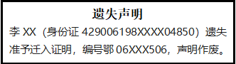 李XX(身份證429006198XXXX04850)遺失準(zhǔn)予遷入證明,編號(hào)鄂06XXX506,聲明作廢。