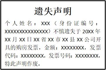 個人姓名:XXX(身份證編號:XXXXXXXXXXXXXXX)不慎遺失于20XX年XX月XX日XX省XX市XX縣XX公司開具的購房發(fā)票,金額:XXXXXXXX,發(fā)票代碼:XXXXXXXX,發(fā)票號碼:XXXXXXXX,特此聲明作廢。