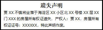 賈XX不慎將坐落于海淀區(qū)XX小區(qū)北XX號樓XX層XX門XXX的房屋所有權證遺失,產權人:賈XX,房屋所有權證證號:XXXXXX,特此聲明作廢。