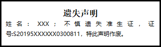 姓名:XXX;不慎遺失準(zhǔn)生證,證號(hào):S20195XXXXXX0300811,特此聲明作廢。