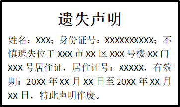 姓名:XXX;身份證號:XXXXXXXXXX;不慎遺失位于XXX市XX區(qū)XXX號樓XX門XXX號居住證,居住證號:XXXXX,有效期:20XX年XX月XX日至20XX年XX月XX日,特此聲明作廢。