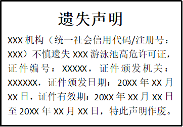XXX機(jī)構(gòu)(統(tǒng)一社會(huì)信用代碼/注冊(cè)號(hào):XXX)不慎遺失XXX游泳池高危許可證,證件編號(hào):XXXXX,證件頒發(fā)機(jī)關(guān):XXXXXX,證件頒發(fā)日期:20XX年XX月XX日,證件有效期:20XX年XX月XX日至20XX年XX月XX日,特此聲明作廢。