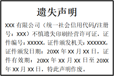 XXX有限公司(統(tǒng)一社會信用代碼/注冊號:XXX)不慎遺失印刷經(jīng)營許可證,證件編號:XXXXX,證件頒發(fā)機(jī)關(guān):XXXXXX,證件頒發(fā)日期:20XX年XX月XX日,證件有效期:20XX年XX月XX日至20XX年XX月XX日,特此聲明作廢。