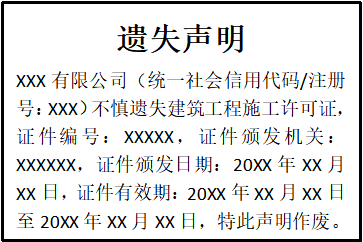 XXX有限公司(統(tǒng)一社會信用代碼/注冊號:XXX)不慎遺失建筑工程施工許可證,證件編號:XXXXX,證件頒發(fā)機關:XXXXXX,證件頒發(fā)日期:20XX年XX月XX日,證件有效期:20XX年XX月XX日至20XX年XX月XX日,特此聲明作廢。
