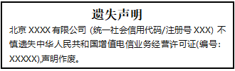北京XXXX有限公司(統(tǒng)一社會(huì)信用代碼/注冊(cè)號(hào)XXX)不慎遺失中華人民共和國(guó)增值電信業(yè)務(wù)經(jīng)營(yíng)許可證(編號(hào):XXXXX),聲明作廢。