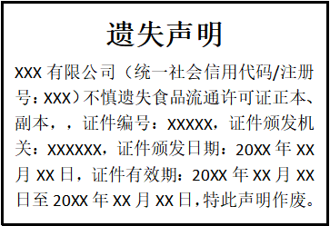 XXX有限公司(統(tǒng)一社會信用代碼/注冊號:XXX)不慎遺失食品流通許可證正本、副本,證件編號:XXXXX,證件頒發(fā)機關(guān):XXXXXX,證件頒發(fā)日期:20XX年XX月XX日,證件有效期:20XX年XX月XX日至20XX年XX月XX日,特此聲明作廢。