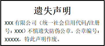 XXX有限公司(統(tǒng)一社會信用代碼/注冊號:XXX)不慎遺失防偽公章,公章編號:XXXXX,特此聲明作廢。