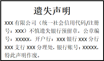 XXX有限公司(統(tǒng)一社會(huì)信用代碼/注冊(cè)號(hào):XXX)不慎遺失銀行預(yù)留章,公章編號(hào):XXXXX,開戶行:XXX銀行XXX分行XXX支行XXX分理處,銀行賬號(hào):XXXXX,特此聲明作廢。