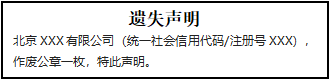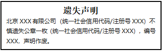北京XXX有限公司(統(tǒng)一社會信用代碼/注冊號XXX)不慎遺失公章一枚(統(tǒng)一社會信用代碼/注冊號XXX),編號XXX,聲明作廢。