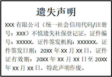 XXX有限公司(統(tǒng)一社會信用代碼/注冊號:XXX)不慎遺失社保登記證,證件編號:XXXXX,證件簽發(fā)機(jī)構(gòu):XXXXXX,證件簽發(fā)日期:20XX年XX月XX日,證件證有效期:20XX年XX月XX日至20XX年XX月XX日,特此聲明作廢。