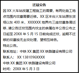 因XX火車站改建工程施工的需要,有兩處施工地點范圍內(nèi)墳?zāi)剐枰w移。XX區(qū)豐臺火車站原東貨場以東400米,XXXXXX地界內(nèi)三座墳?zāi)辜毙柽w移,請公告遷墳范圍內(nèi)墳主的親屬在本公告公布之日起至20XX年5月15日前完成遷墳,逾期不遷移的墳?zāi)拱礋o主墳處理,望相互轉(zhuǎn)告。