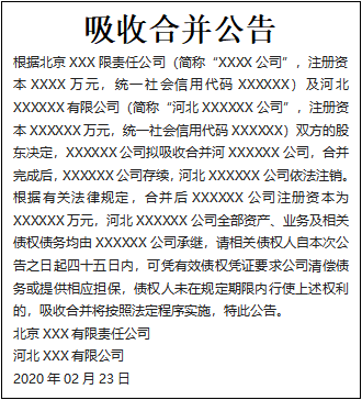 根據(jù)北京XXX限責(zé)任公司(簡稱“XXXX公司”,注冊資本XXXX萬元,統(tǒng)一社會信用代碼XXXXXX)及河北XXXXXX有限公司(簡稱“河北XXXXXX公司”,注冊資本XXXXXX萬元,統(tǒng)一社會信用代碼XXXXXX)雙方的股東決定,XXXXXX公司擬吸收合并河XXXXXX公司,合并完成后,XXXXXX公司存續(xù),河北XXXXXX公司依法注銷。根據(jù)有關(guān)法律規(guī)定,合并后XXXXXX公司注冊資本為XXXXXX萬元,河北XXXXXX公司全部資產(chǎn)、業(yè)務(wù)及相關(guān)債權(quán)債務(wù)均由XXXXXX公司承繼,請相關(guān)債權(quán)人自本次公告之日起四十五日內(nèi),可憑有效債權(quán)憑證要求公司清償債務(wù)或提供相應(yīng)擔(dān)保,債權(quán)人未在規(guī)定期限內(nèi)行使上述權(quán)利的,吸收合并將按照法定程序?qū)嵤,特此公告?/div>