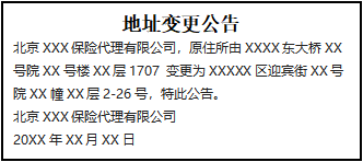 北京XXX保險代理有限公司,原住所由XXXX東大橋XX號院XX號樓XX層1707 變更為XXXXX區(qū)迎賓街XX號院XX幢XX層2-26號,特此公告。