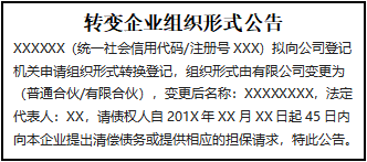 XXXXXX(統(tǒng)一社會信用代碼/注冊號XXX)擬向公司登記機關申請組織形式轉換登記,組織形式由有限公司變更為(普通合伙/有限合伙),變更后名稱:XXXXXXXX,法定代表人:XX,請債權人自201X年XX月XX日起45日內向本企業(yè)提出清償債務或提供相應的擔保請求,特此公告。