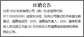 注銷公告:北京XXX科技有限公司(統(tǒng)一社會(huì)信用代碼:91110XXXXXX)經(jīng)股東決定,擬向公司登記機(jī)關(guān)申請(qǐng)注銷登記,清算組成員:XXX,清算組負(fù)責(zé)人:XXX,請(qǐng)債權(quán)債務(wù)人自見報(bào)之日起45日內(nèi)向本公司清算組申報(bào)債權(quán)債務(wù),特此公告。