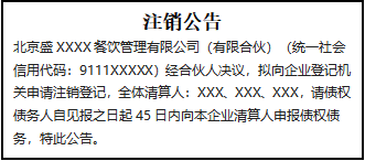 注銷公告:北京盛XXXX餐飲管理有限公司(有限合伙)(統(tǒng)一社會(huì)信用代碼:9111XXXXX)經(jīng)合伙人決議,擬向企業(yè)登記機(jī)關(guān)申請(qǐng)注銷登記,全體清算人:XXX、XXX、XXX,請(qǐng)債權(quán)債務(wù)人自見報(bào)之日起45日內(nèi)向本企業(yè)清算人申報(bào)債權(quán)債務(wù),特此公告。