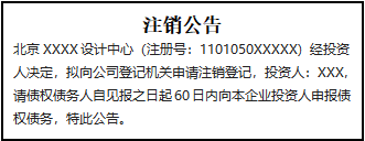 注銷公告:北京XXXX設(shè)計(jì)中心(注冊(cè)號(hào):1101050XXXXX)經(jīng)投資人決定,擬向公司登記機(jī)關(guān)申請(qǐng)注銷登記,投資人:XXX,請(qǐng)債權(quán)債務(wù)人自見報(bào)之日起60日內(nèi)向本企業(yè)投資人申報(bào)債權(quán)債務(wù),特此公告。