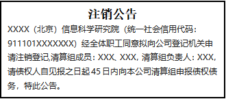 注銷公告:XXXX(北京)信息科學(xué)研究院(統(tǒng)一社會(huì)信用代碼:911101XXXXXXX)經(jīng)全體職工同意擬向公司登記機(jī)關(guān)申請(qǐng)注銷登記,清算組成員:XXX、XXX,清算組負(fù)責(zé)人:XXX,請(qǐng)債權(quán)人自見報(bào)之日起45日內(nèi)向本公司清算組申報(bào)債權(quán)債務(wù),特此公告。