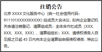 注銷公告:北京XXXX文化服務(wù)中心(統(tǒng)一社會(huì)信用代碼:911101XXXXXXXXXX)經(jīng)成員大會(huì)決議,擬向企業(yè)登記機(jī)關(guān)申請(qǐng)注銷登記,清算組成員:全體合作社成員(XXX、XXX、XXX、XXX),清算組組長(zhǎng):XXX,請(qǐng)債權(quán)債務(wù)人自見報(bào)之日起45日內(nèi)向本企業(yè)清算組申報(bào)債權(quán)債務(wù),特此公告。
