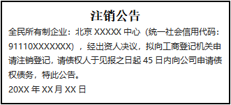注銷公告:全民所有制企業(yè);北京XXXXX中心(統(tǒng)一社會(huì)信用代碼:91110XXXXXXX),經(jīng)出資人決議,擬向工商登記機(jī)關(guān)申請(qǐng)注銷登記,請(qǐng)債權(quán)人于見報(bào)之日起45日內(nèi)向公司申請(qǐng)債權(quán)債務(wù),特此公告。