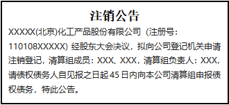 注銷公告:XXXXX(北京)化工產(chǎn)品股份有限公司(注冊(cè)號(hào):110108XXXXX)經(jīng)股東大會(huì)決議,擬向公司登記機(jī)關(guān)申請(qǐng)注銷登記,清算組成員:XXX、XXX,清算組負(fù)責(zé)人:XXX,請(qǐng)債權(quán)債務(wù)人自見報(bào)之日起45日內(nèi)向本公司清算組申報(bào)債權(quán)債務(wù),特此公告。