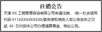 注銷公告:天津XX工程管理咨詢有限公司申請(qǐng)注銷, 統(tǒng)一社會(huì)信用代碼911XXXXXXXXXX,敬告?zhèn)鶛?quán)債務(wù)人自公告發(fā)布之日起 45 日內(nèi)到本公司辦理清算事宜,特此公告。