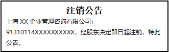 注銷公告:上海XX企業(yè)管理咨詢有限公司:91310114XXXXXXXXXX,經(jīng)股東決定即日起注銷,特此公告。