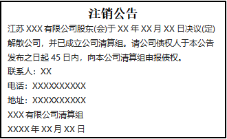 注銷公告:江蘇XXX有限公司股東(會(huì))于XX年XX月XX日決議(定)解散公司,并已成立公司清算組。請(qǐng)公司債權(quán)人于本公告發(fā)布之日起45日內(nèi),向本公司清算組申報(bào)債權(quán)。