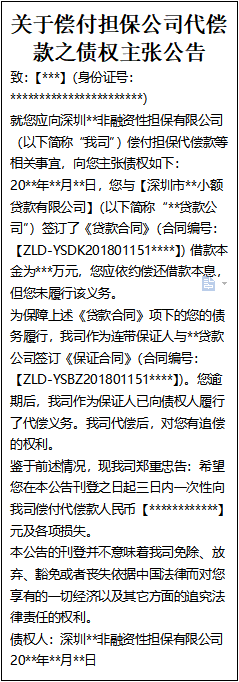 關(guān)于償付擔(dān)保公司代償款之債權(quán)主張公告