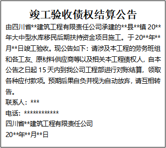 由四川省**建筑工程有限責任公司承建的**縣**鎮(zhèn)20**年大中型水庫移民后期扶持資金項目施工。于20**年**月**日竣工驗收,F公告如下:請涉及本工程的勞務班組和各工友、原材料供應商等以及相關本工程債權人,自本公告之日起15天內到我公司工程部進行對賬結算,領取各種應付款項。預期后果自負并視為自動放棄,請互相轉告。