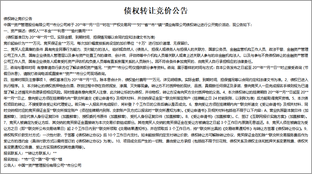 四、掛牌時限及注意事項1、債權(quán)基準(zhǔn)日為20**年**月**日。除本息合計外,債權(quán)墊付費用****萬元,詳見明細(xì)表。實際金額、到期時間、擔(dān)保情況等以合同約定和法律文書為準(zhǔn)。2、債權(quán)已進(jìn)入執(zhí)行程序。3、本次轉(zhuǎn)讓的債權(quán)質(zhì)押物含白酒,存放過程中存在自然揮發(fā)、滲漏、滅失等現(xiàn)象。轉(zhuǎn)讓方不對質(zhì)押物的現(xiàn)狀、品質(zhì),真假做任何保證及承諾,意向競買人一旦完成報名手續(xù)則視為已清楚了解上述情況并自愿承擔(dān)相應(yīng)風(fēng)險。同時提請各意向競買人注意,此次轉(zhuǎn)讓標(biāo)的為債權(quán),并非物權(quán),轉(zhuǎn)讓方?jīng)]有向買方交付質(zhì)押物的義務(wù)。4、本次債權(quán)轉(zhuǎn)讓的掛牌期自20**年**月**日起至20**年**月**日止,意向受讓方須在掛牌期內(nèi)向**聯(lián)交所遞交《受讓申請書》及相關(guān)材料,并交納保證金至**聯(lián)交所指定賬戶(掛牌截止日24時前到賬,以到賬為準(zhǔn))后方能取得競買資格。5、本次債權(quán)項目的轉(zhuǎn)讓,不接受聯(lián)合受讓和代理受讓。若只有一人報名并完成報價,將補(bǔ)登7個工作日的公告后確認(rèn)是否成交。6、意向受讓方須在掛牌期內(nèi)向**聯(lián)交所遞交《受讓申請書》及相關(guān)材料,同時交納相對應(yīng)的競買保證金至**聯(lián)交所指定賬戶(須在掛牌期內(nèi)到賬,交款賬戶及方式以報名時**聯(lián)交所通知為準(zhǔn))!妒茏屔暾垥芳跋嚓P(guān)材料包括但不限于以下內(nèi)容:A、營業(yè)執(zhí)照副本復(fù)印件(加蓋鮮章)、法定代表人身份證復(fù)印件(加蓋鮮章)、授權(quán)委托書原件(加蓋鮮章)、受托人身份證復(fù)印件(加蓋鮮章)。B、《受讓申請書》(加蓋鮮章)。C、簽訂《互聯(lián)網(wǎng)報價實施方案》(加蓋鮮章)。7、競買人被確定為受讓方后,其交納的競買保證金直接轉(zhuǎn)為本次交易價款組成部分。其他競買人交納的競買保證金在受讓方被確定之日起3個工作日內(nèi)原路無息返還。8、競買人須在被確定為受讓方之日(即**聯(lián)交所公布交易結(jié)果日)起2個工作日內(nèi)到**聯(lián)交所領(lǐng)取《交易結(jié)果通知書》,并在領(lǐng)取后3個工作日內(nèi),持**聯(lián)交所出具的《交易結(jié)果通知書》與轉(zhuǎn)讓方簽署《債權(quán)轉(zhuǎn)讓協(xié)議》。9、債權(quán)購買價款支付方式:一次性付款,于簽署《債權(quán)轉(zhuǎn)讓協(xié)議》后10個工作日內(nèi)支付。如未能按照約定支付轉(zhuǎn)讓價款,債權(quán)轉(zhuǎn)讓方可解除轉(zhuǎn)讓協(xié)議,競買保證金在扣除**聯(lián)交所交易服務(wù)費后作為受讓方的違約金(具體付款方式以最終簽訂的《債權(quán)轉(zhuǎn)讓協(xié)議》為準(zhǔn))。10、項目成交后產(chǎn)生的一切稅、費由受讓方承擔(dān)(包括但不限于印花稅、債權(quán)關(guān)系及債權(quán)主體和抵押關(guān)系變更稅費、債權(quán)關(guān)系變更通知公告費、受讓方實現(xiàn)債權(quán)的其他費用等)。