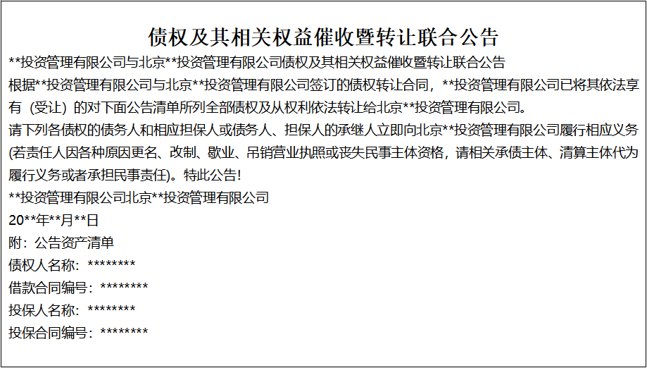 債權(quán)及其相關(guān)權(quán)益催收暨轉(zhuǎn)讓聯(lián)合公告