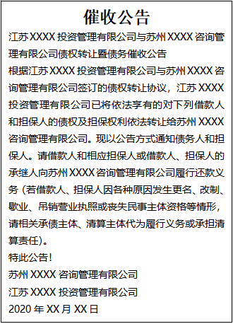 根據(jù)江蘇XXXX投資管理有限公司與蘇州XXXX咨詢管理有限公司簽訂的債權(quán)轉(zhuǎn)讓協(xié)議,江蘇XXXX投資管理有限公司已將依法享有的對下列借款人和擔保人的債權(quán)及擔保權(quán)利依法轉(zhuǎn)讓給蘇州XXXX咨詢管理有限公司,F(xiàn)以公告方式通知債務(wù)人和擔保人。請借款人和相應(yīng)擔保人或借款人、擔保人的承繼人向蘇州XXXX咨詢管理有限公司履行還款義務(wù)(若借款人、擔保人因各種原因發(fā)生更名、改制、歇業(yè)、吊銷營業(yè)執(zhí)照或喪失民事主體資格等情形,請相關(guān)承債主體、清算主體代為履行義務(wù)或承擔清算責任)。