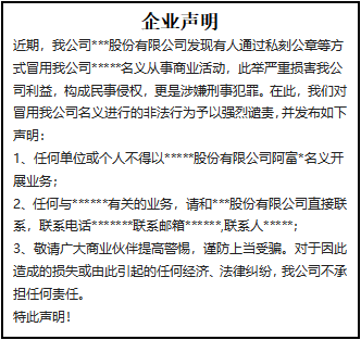 近期,我公司***股份有限公司發(fā)現(xiàn)有人通過私刻公章等方式冒用我公司*****名義從事商業(yè)活動,此舉嚴(yán)重?fù)p害我公司利益,構(gòu)成民事侵權(quán),更是涉嫌刑事犯罪。在此,我們對冒用我公司名義進(jìn)行的非法行為予以強(qiáng)烈譴責(zé),并發(fā)布如下聲明: