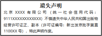 北京XXXX有限公司(統(tǒng)一社會信用代碼:9111XXXXXXXXXXXX)不慎遺失中華人民共和國出版物經(jīng)營許可證正、副本(許可證編號:新出發(fā)京批字第直1100XX號),特此聲明作廢。